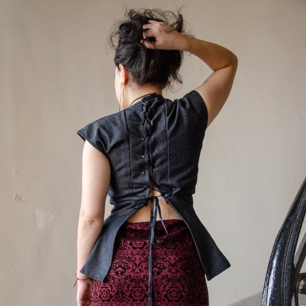 acceso por acordonado en la espalda y con un acordonado en el centro de busto para realzarlo.