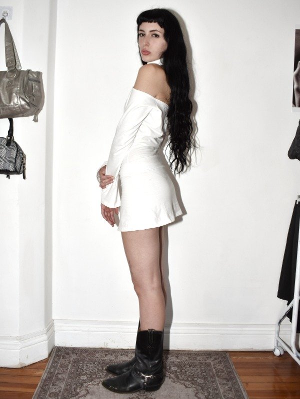 Vestido de algodón con mangas y falda evasé a los 1970s. Muy cómodo y con un calce fantasioso. Disponible en blanco y negro. Con una bufandita de regalo!